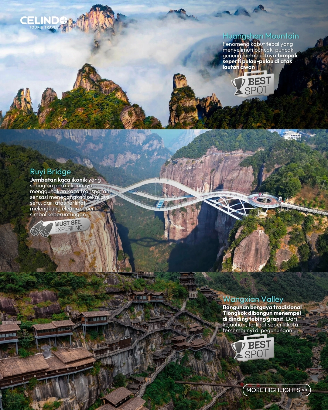 Nikmati keindahan gunung legendaris dengan puncak granit, lautan awan, dan panorama alam yang luar biasa.