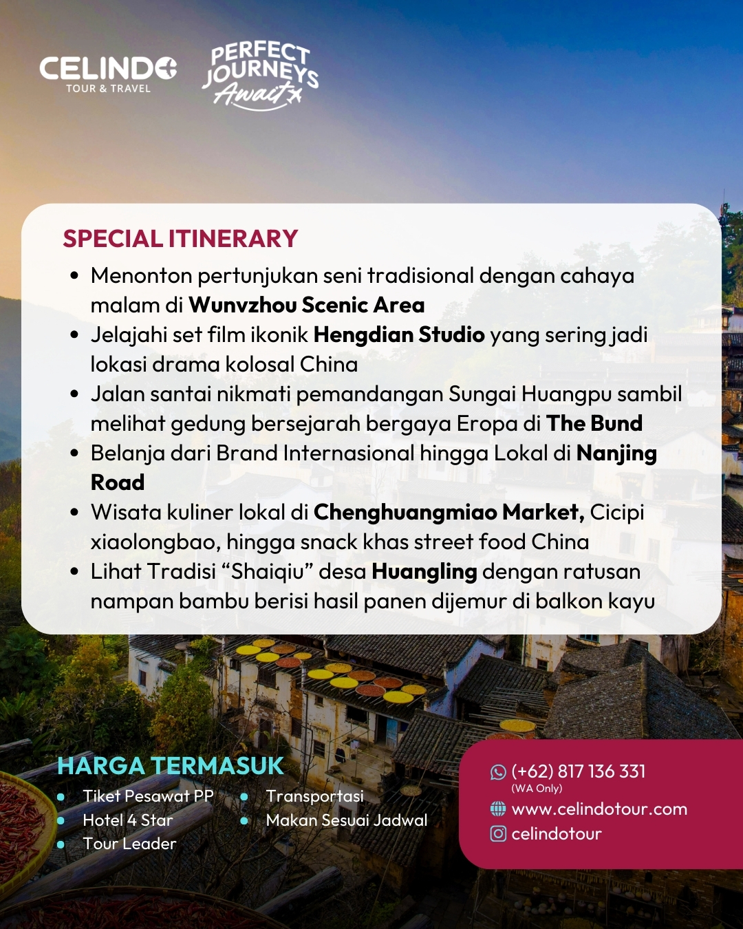 Setelah sarapan diajak mengunjungi YIWU INTERNATIONAL TRADE CITY, sebuah mall grosir terkenal saat ini. Siang hari menuju ke WANGXIAN VALLEY untuk berjalan-jalan dan menikmati keindahan alam yang menakjubkan dan juga bangunan dengan arsitektur tradisionalnya yang memikat di malam hari. Bermalam di SHANGRAO. (Breakfast/Lunch/Dinner)