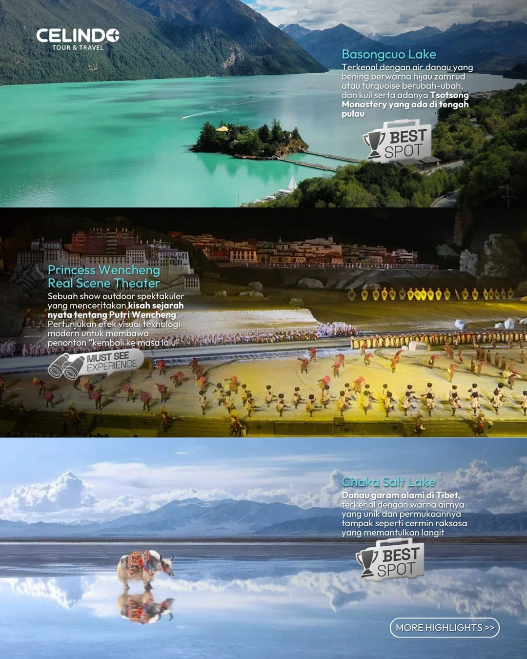 Hari ini mengunjungi BASONGCUO LAKE yang terkenal dengan perpaduan danau, pulau dan kuil serta adanya TSOTSONG MONASTERY yang ada di tengah pulau. Anda bisa mengagumi keindahan padang rumput, danau serta puncak gunung Mila. (Breakfast/Lunch/Dinner)