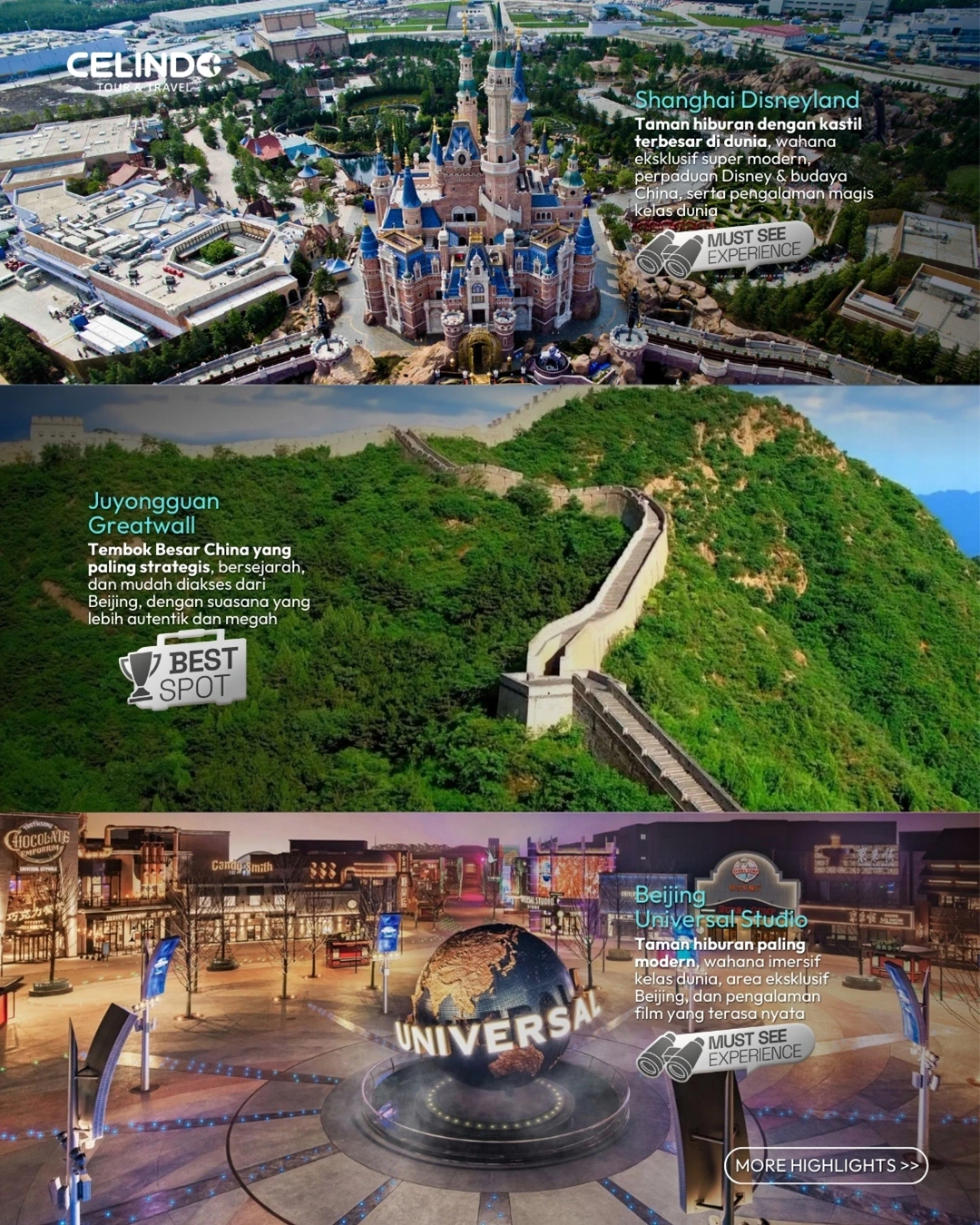 Kunjungi salah satu keajaiban dunia yang legendaris. Nikmati pemandangan pegunungan yang megah sambil berjalan di sepanjang tembok bersejarah Tiongkok.