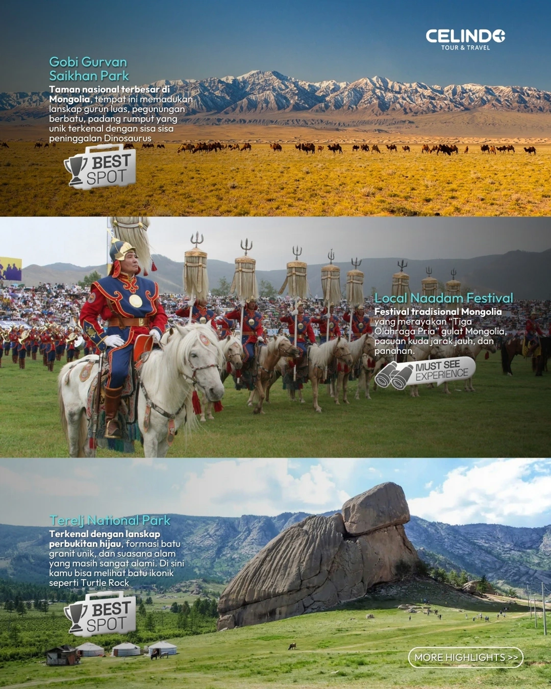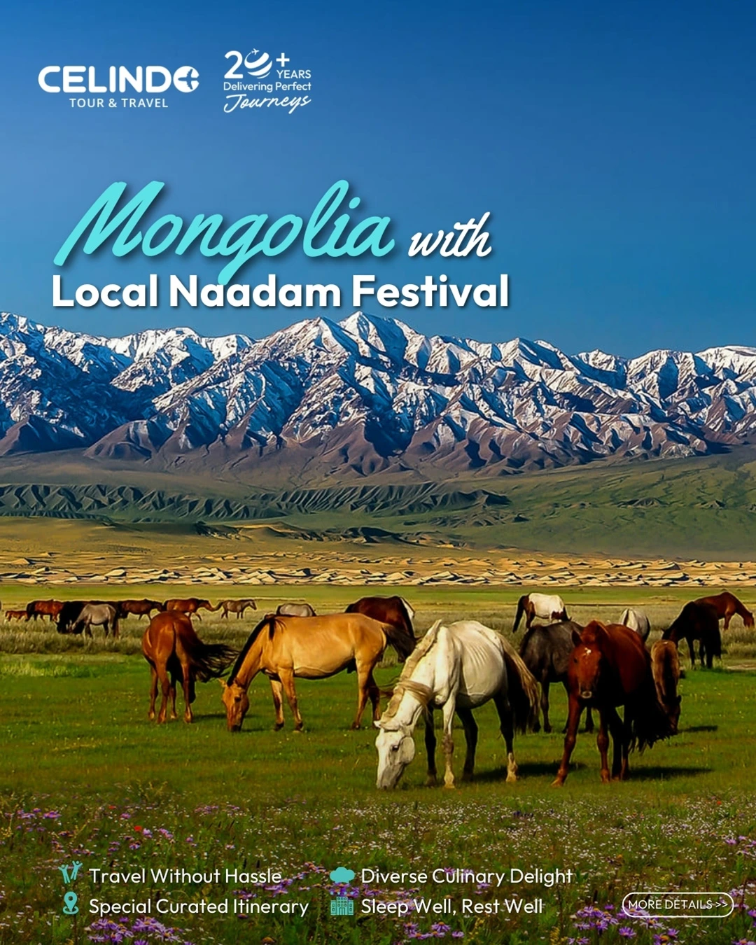 Anda akan diajak menikmati LOCAL NAADAM FESTIVAL, di mana Anda dapat menyaksikan opening ceremony serta berbagai permainan tradisional Mongolia yang dikenal sebagai “THREE MANLY GAMES”, yaitu gulat, pacuan kuda, dan panahan. Anda juga berkesempatan mencoba permainan tradisional khas Mongolia seperti ANKLE BONE SHOOTING. Bermalam di GER CAMP. (Breakfast/Lunch/Dinner)