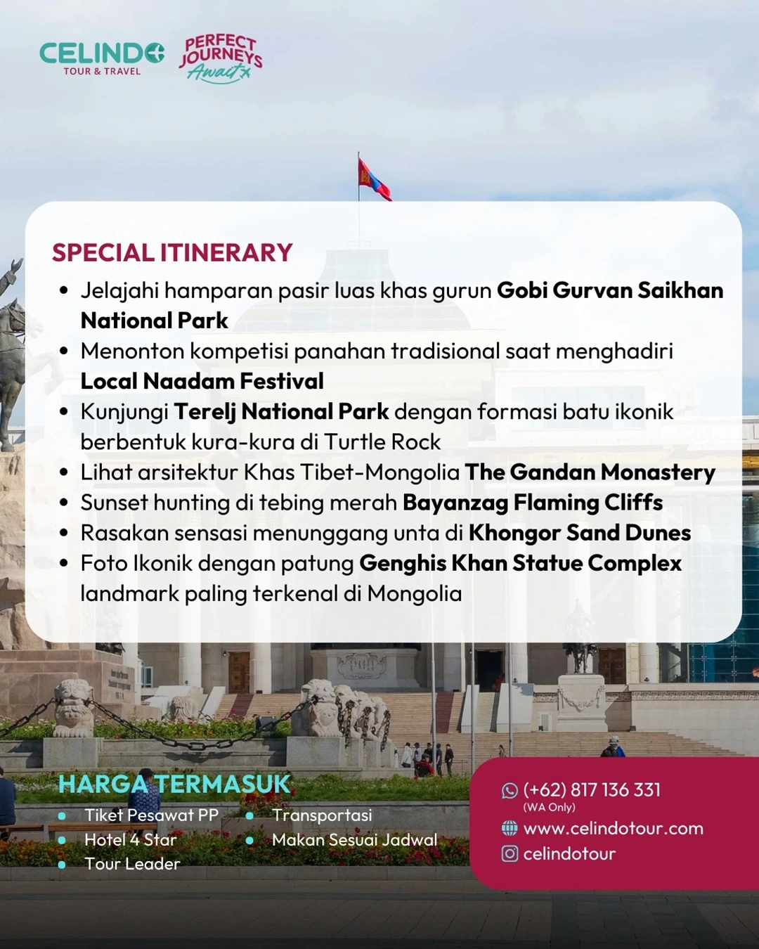 Pagi ini Anda akan mengunjungi TERELJ NATIONAL PARK untuk menikmati pemandangan pegunungan serta formasi batu yang unik. Lalu GENGHIS KHAN MONUMENT COMPLEX yang merupakan pendiri dan pemimpin besar Kekaisaran Mongol. Malam hari, Anda akan menyaksikan pertunjukan dari kisah Mongolian Folkore. (Breakfast/Lunch/Dinner)